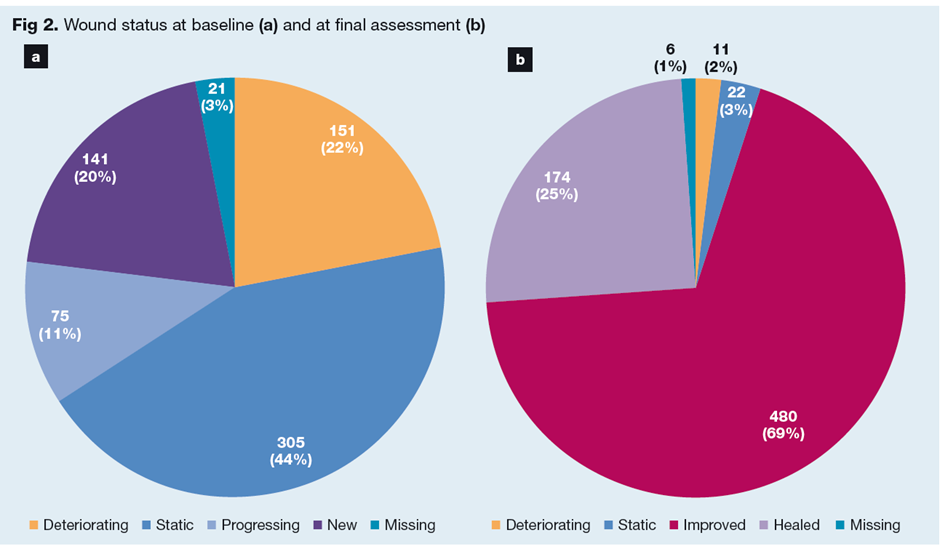 Al inicio, sólo el 11% de las heridas progresaban; El 44% de las heridas estaban estáticas y el 22% se estaban deteriorando (Fig. 2a). En la evaluación final, la mayoría de las heridas habían mejorado desde el inicio (69%) o habían cicatrizado (25%). Sólo una pequeña proporción de las heridas estaban estáticas (3%) y en deterioro (2%) en la evaluación final (Fig. 1b).4